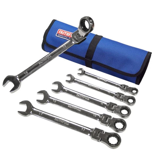 The Faithfull Ratchet Combination Spanner Set in Tool Roll, 6 Piece, has a chrome vanadium finish and flexible ratchet heads, which can turn throug...